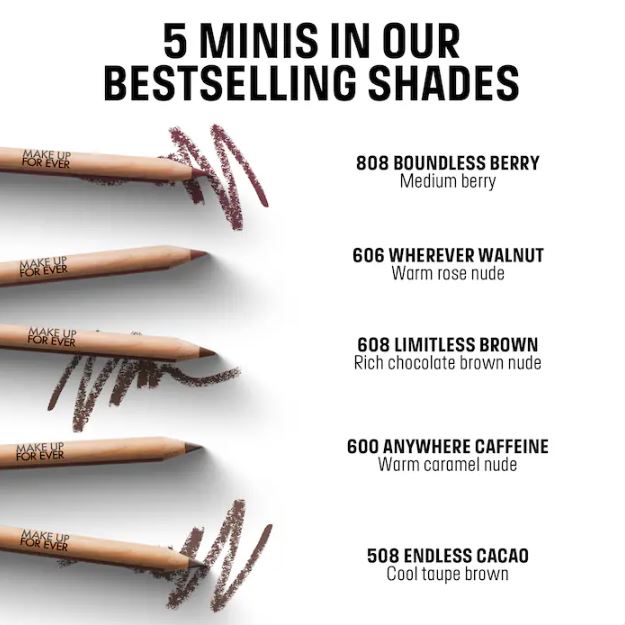 Cinco tonos virales en versión mini para delinear, definir y contornear los labios con una fórmula cremosa y fácil de difuminar.